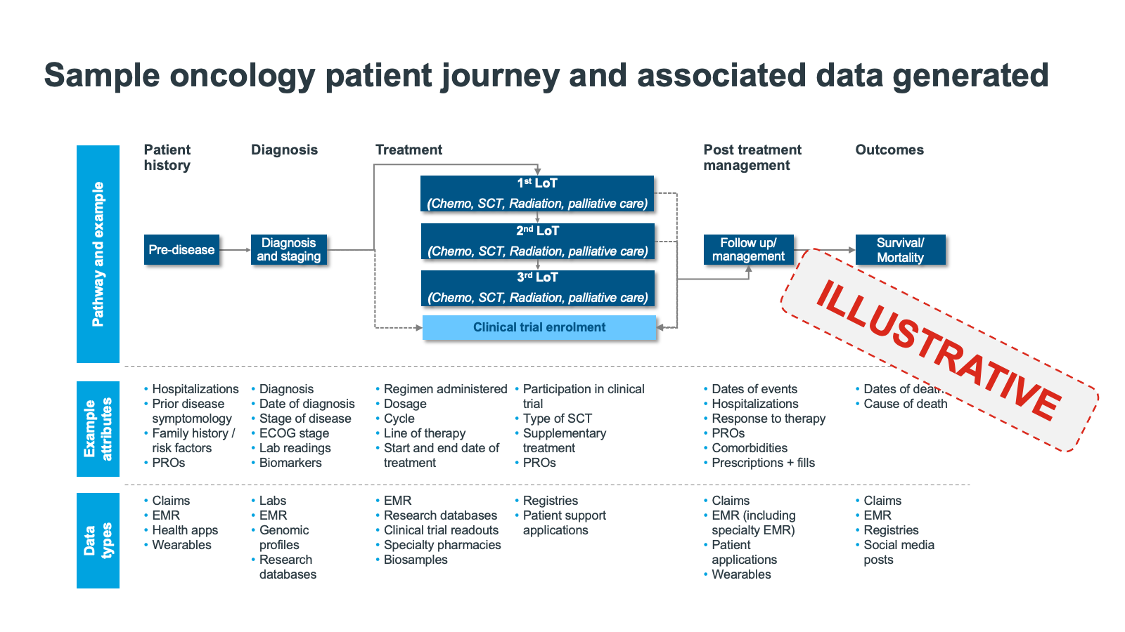 图1:肿瘤病人样本行程和生成相关数据鉴于现代病人行程多点触点,单数据源提供对病人护理路径和相关质量、值和结果的准确综合透视具有挑战性。
