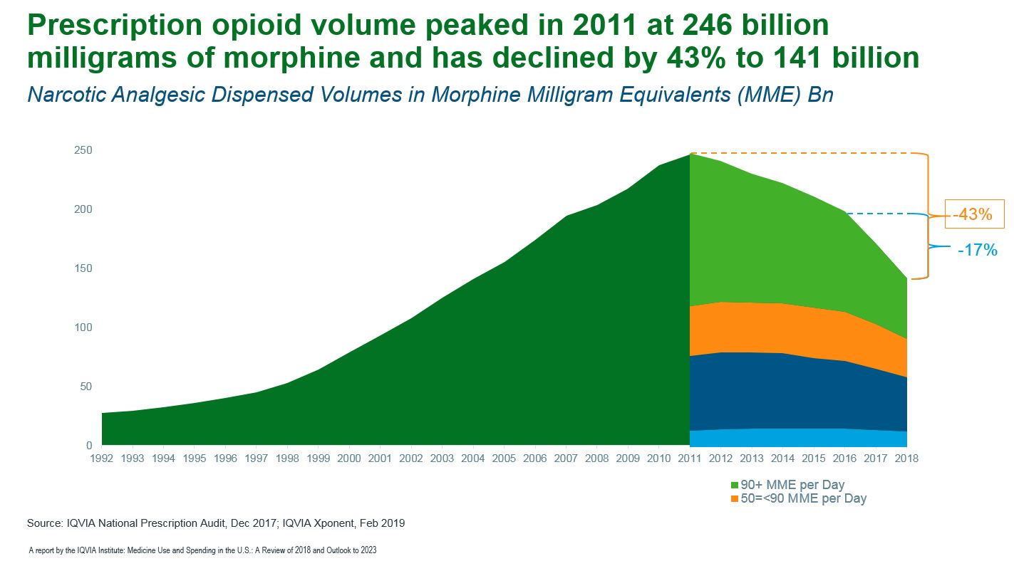 在最近的研究中药用美国2018年审查Outlook2023并审查类阿片策略的趋势和有效性处方类阿片量去年继续急剧下降,因为条例和临床指南变化加上公众高度认识驱动吗啡mgm等量总量下降17%最大下降出自最强和最危险的高剂量处方自2011年峰值以来处方类阿片体积下降43%,每日90兆兆米处方下降61%或更高(见展览)。