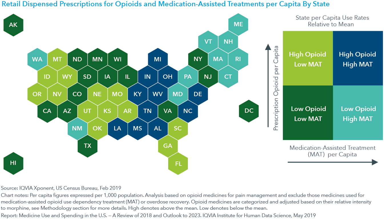 但像美国州级和地方级不同政策实验解决区域问题,进展并不均衡各国在类阿片和药物辅助治疗药物滥用失序方面人均使用率仍然大相径庭。新英格兰所有州过去三年都对类阿片处方和支持类阿片依赖实施新控制,但人均类阿片水平已低于平均水平,但人均MAT水平较高。其他国家,包括受类阿片危机影响最大国家,人均类阿片和MAT使用量相对较高(见展览)。