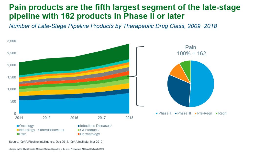 当然,我们不真正解决类阿片危机 如果我们通过消除那些没有其他选择者的痛苦处理而制造另一场危机疼痛药,包括非麻醉品药,下降了2100万处方,这在很大程度上受处方类阿片使用量下降驱动,而对其他类疼痛治疗使用量极少(如果有的话)抵消不了为解决未满足需求,药厂公司正在研究有效易上瘾的药品和器件,止痛产品代表晚期管道第五大段(见展览)。