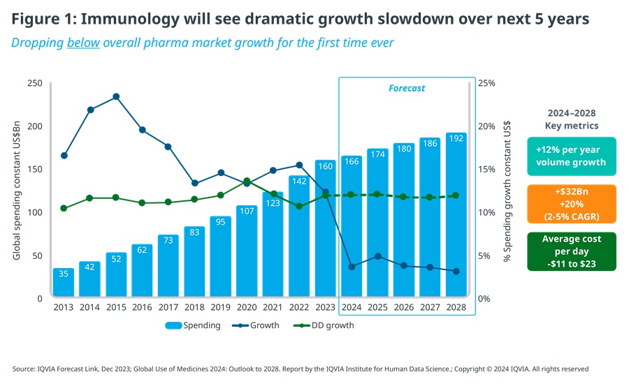 20年来,免疫学一直是生物制药行业主要增长引擎之一,持续两位数增长范围从12%到23%YY约3-5倍处方药市场总速率2024年底预测全球按前制造商价格将达1 660亿美元,这使免疫学按值排第二大治疗区