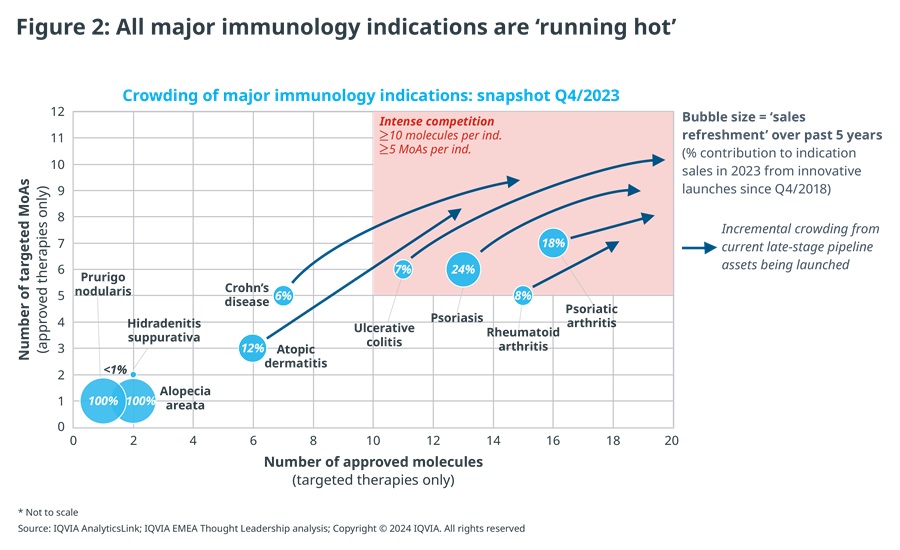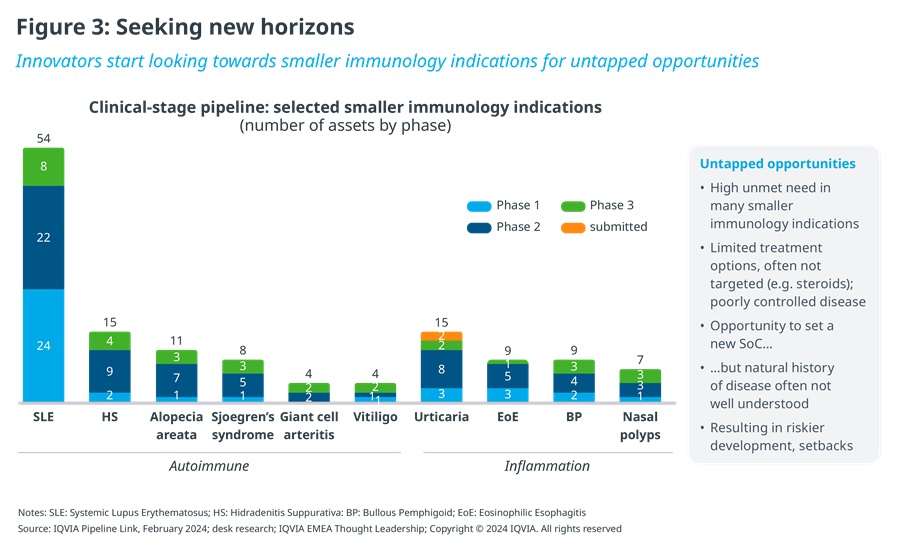 毫不奇怪,创新者被迫到别处寻找未来增长中,它们正越来越多地寻找较小的免疫标志,寻找未开发的机会和免疫学内通常不成熟的发炎段,免疫学内仍然提供充足的白空间(见图3)。