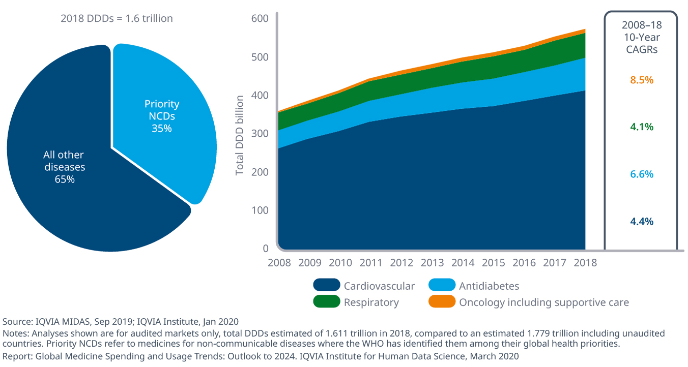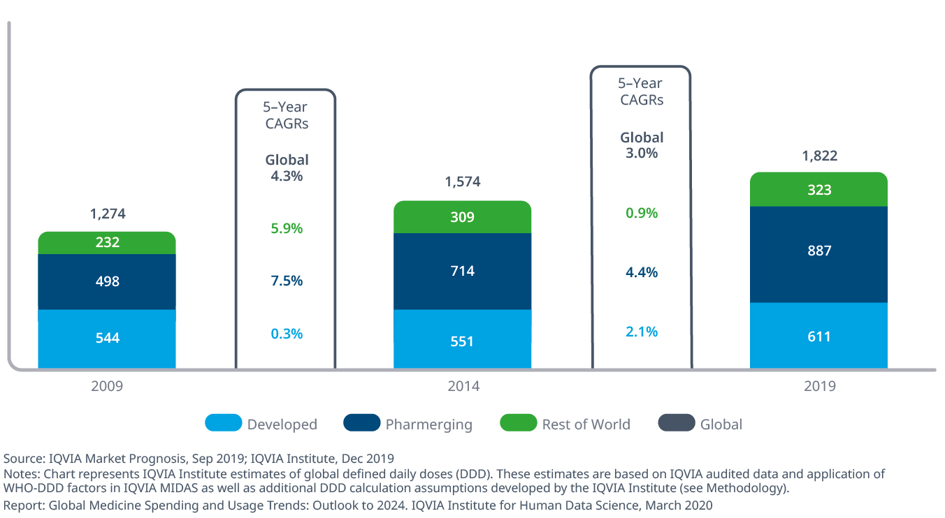 总体而言,自2014年以来,全球医学使用以3%的复合年增长率(CAGR)增长,从2009 - 2014年的4%速度放慢速度。2019年,全球患者估计接受了1.8万亿天的治疗,平均每人234天。大多数药物使用都是在药物市场中,人口众多,但人均使用率仍然明显低于高收入国家。被确定为全球健康优先事项的领域,例如糖尿病和心血管疾病lol买外围用什么软件,已经大大增加了药物使用的使用。全球医学支出预计每年将增加2-5%,在2024年超过1.1万亿美元。与过去五年相比,大多数发达和药房市场的增长率下降速度下降,利率在1-4%至中。分别为5-8%。