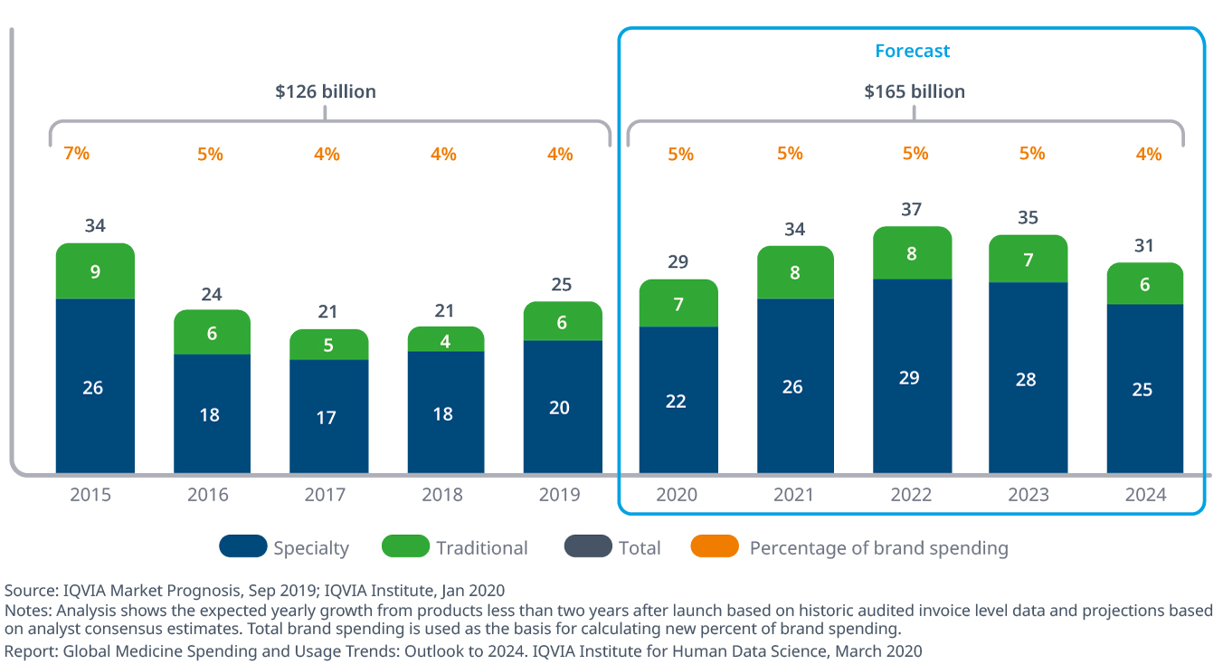 新品牌将贡献1650亿美元的支出增长到2024年,高于过去五年中的1,260亿美元,而品牌Loes预计将对2020 - 2024年的品牌销售产生1390亿美元的负面影响,而2014年从2014年开始产生了1007亿美元的影响。–2019。在未来五年内,美国的净价格预计将在美国上涨1%至2%,高于历史水平,而在其他发达市场中,预计净价下降了-2至-5%。持续的付款人和政府行动。付款人管理总体成本增长趋势的方法将面临挑战,这是由于价格上的不确定性以及对越来越多的专业,利基和稀有疾病药物的支出的影响。
