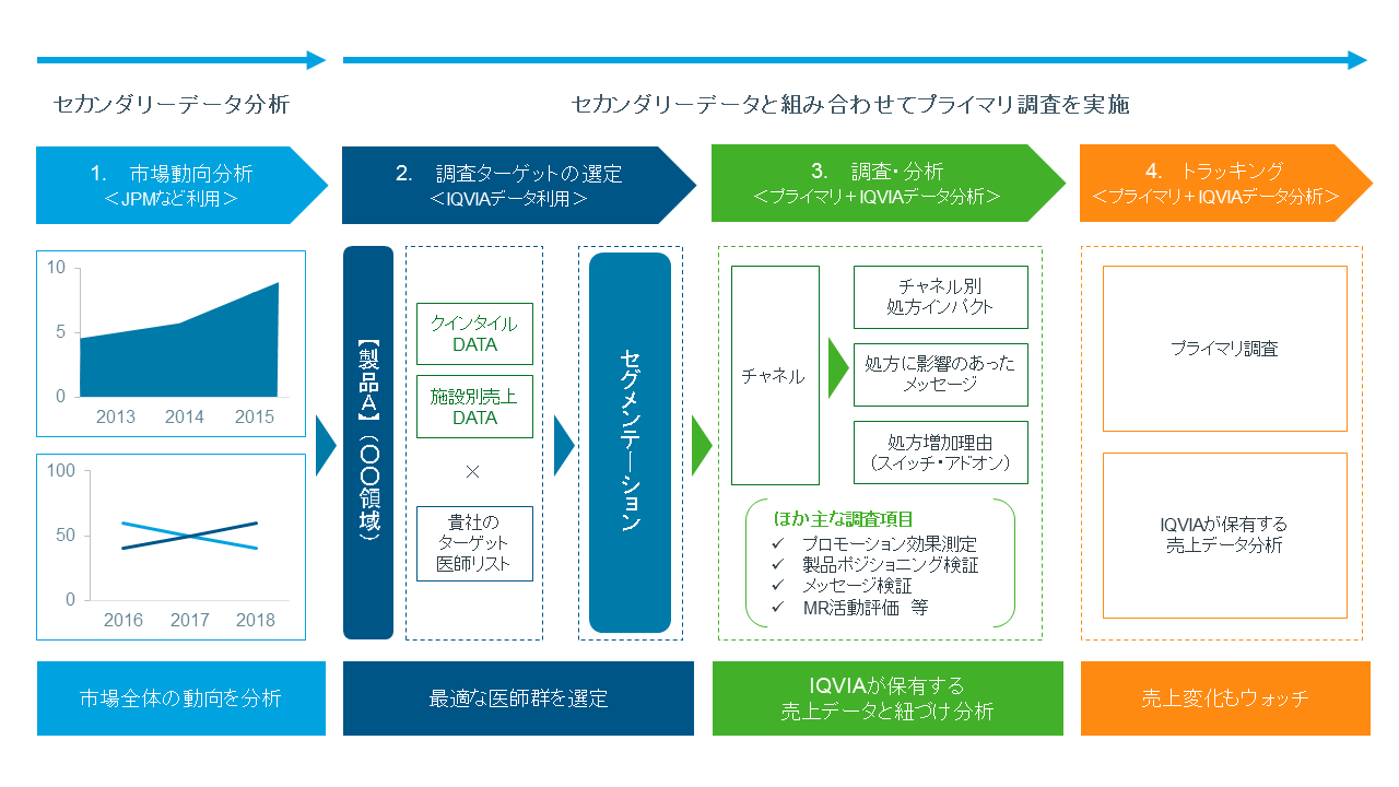 IQVIAの豊富なセカンダリーデータ分析とプライマリー・マーケティング・リサーチ(PMR)をワンストップでご提供し,マーケティングプランのPDCAをフルサポートします。
