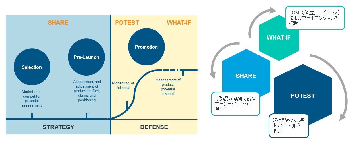 SHARE-POTEST®は,製品ライフサイクルの様々な場面で,製品ポテンシャルを把握し,ポテンシャル最大化に向けた方向性を探るための調査分析手法です。