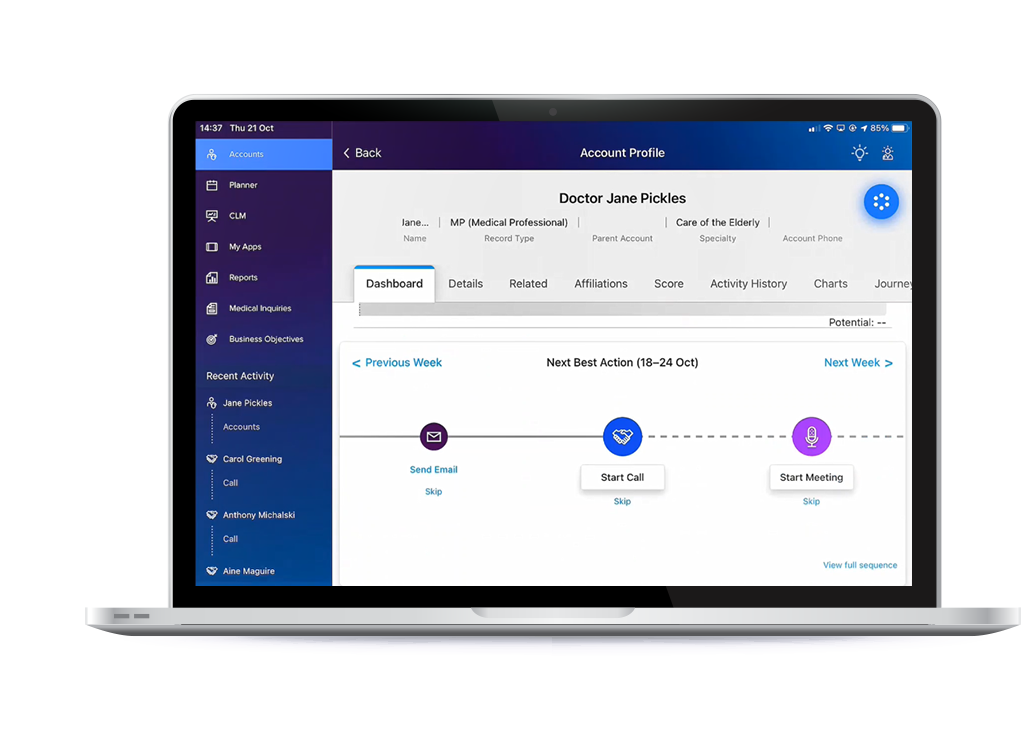 奥西个人整合了所有接触点在面向客户的角色,支持销售代表,医学科学联络人(韩剧)和关键客户经理(金)的所有功能的传统客户关系管理(CRM) +闭环营销(CLM),无与伦比的移动访问和先进的嵌入式智能。