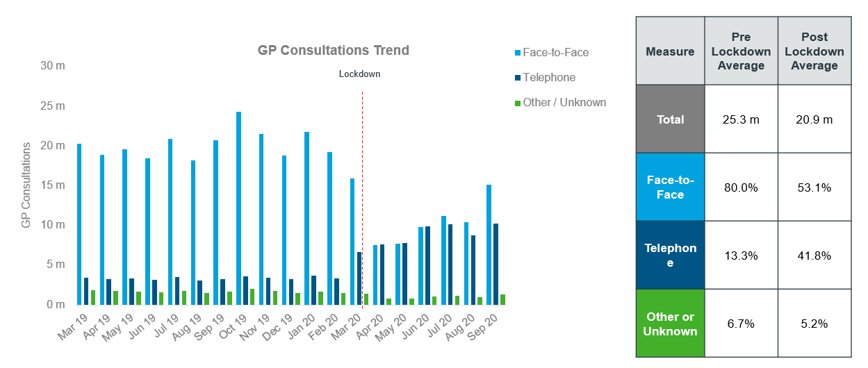 直到9月份,我们看到了转回的预期数量GP磋商而提前锁定。然而,有趣的是这些任命的分裂,以及从面对面的转移到电话预约(图1)。电话预约的百分比增加了三倍在过去几个月里,平均13.3%的pre COVID高达41.8%的封锁。这种转变将需要数年时间,现在发生在不到9个月。这会是前进的“新常态”的方法,会影响面对面接触目前在社区药房吗?