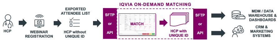 IQVIA On-demand Matching可以应用于此用例以自动化HCP的识别,从而提供唯一的客户主标识符,以便您的系统可以连接和消耗此数据。