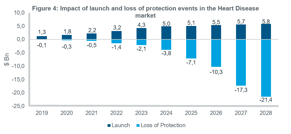 预测链接显示,到2023年,心脏病市场将可发现多达25场启动事件2028年这些新启动的影响将扩大市场约58亿美元(图3)。然而,由于一些关键药行联手并随之低价非专利品上市,到2028年全球市场销售量将净减214亿美元以上。IQVIA预测链路预测,2019-2028年间至少将发生137 LoP事件