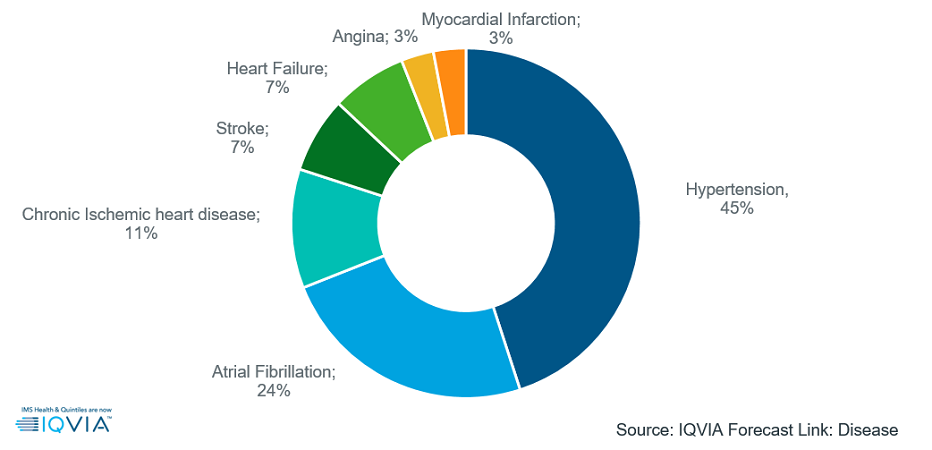 高血压市场在其他心脏病中名列前茅,2018年处方药销售出320亿美元,预计CAGR增长1.7%至2028年并保持到2028年的位置,在1%的CAGR上增长。图1显示2028年心病市场预测
