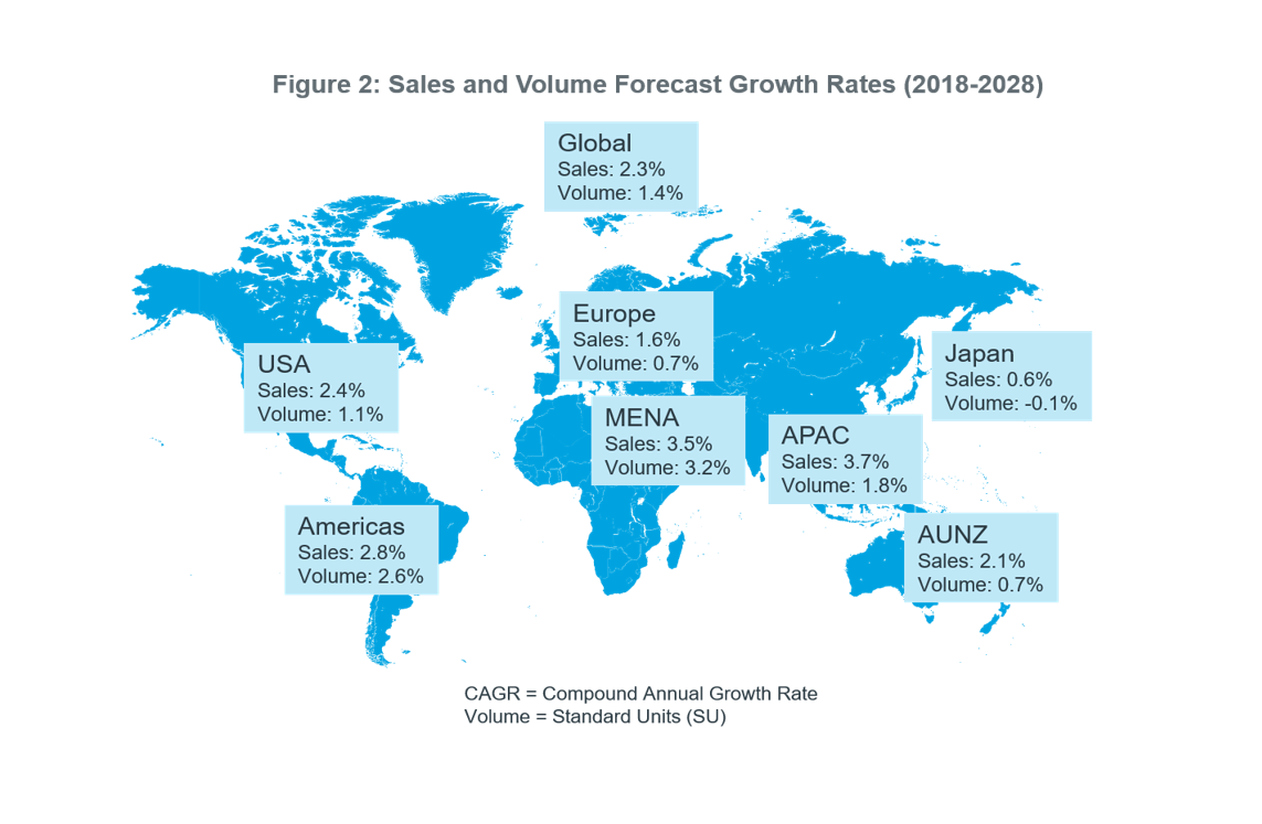 从销售增长百分比看,APAC国家将看到最大销售增长,驱动力为新启动和病人日数增加流体积前端 MENA将观察最高增长药处理病人日量预测略增,未来10年全球平均增长1.4%图2显示2018至2028年销售量预测增速