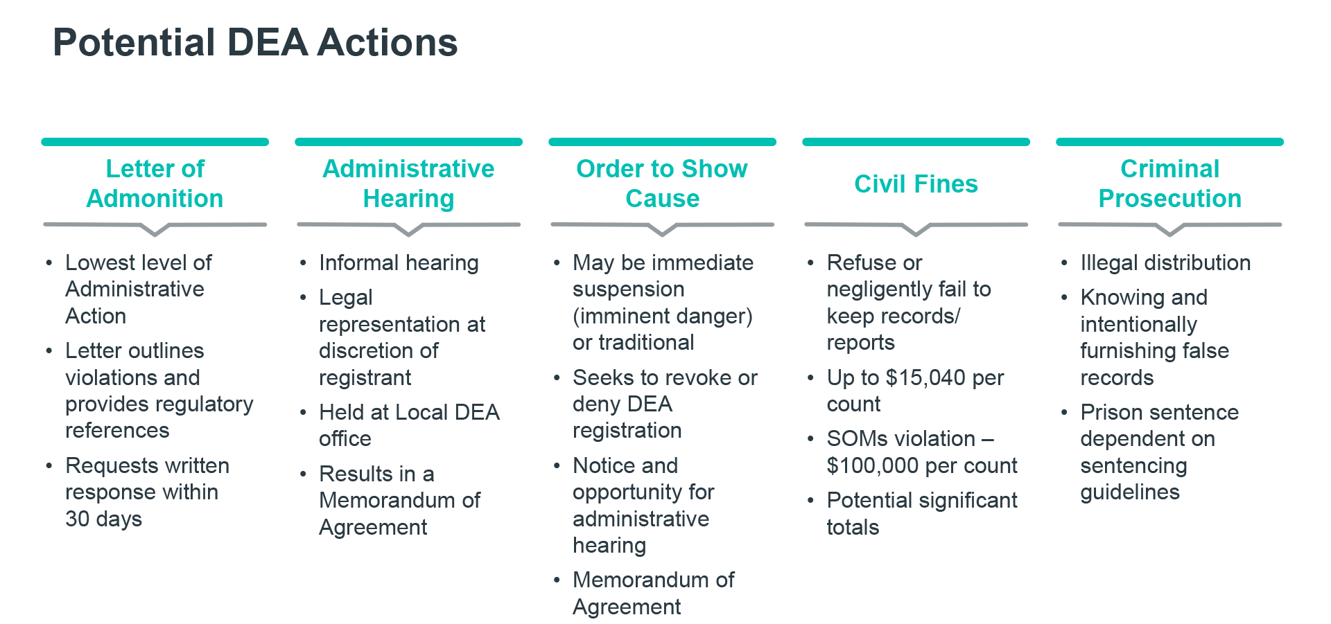 准备DEA检验的最佳方式是管理您的守法程序 仿佛检查员随时会出现即更新所有记录,24小时内报告任何可疑活动,对客户和供应商进行定期背景调查,对财产和技术平台保持严格安全控制